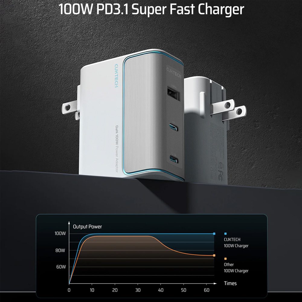 Điểm nổi bật nhất của CUKTECH AD1003US chính là khả năng sạc nhanh với công suất cực đại 100W, giúp tiết kiệm thời gian và nâng cao hiệu quả sử dụng thiết bị. Với công suất này, người dùng có thể dễ dàng sạc đầy MacBook Pro, ThinkPad, Xiaomi 14 Pro hay các dòng ultrabook chỉ trong thời gian ngắn.