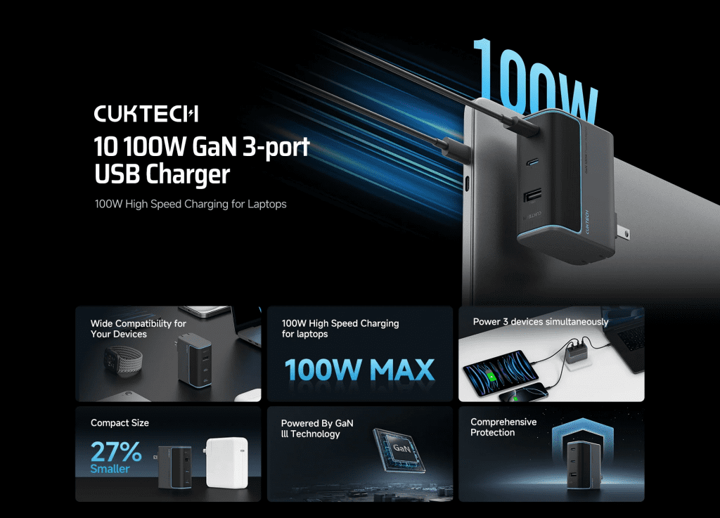 Với công suất tối đa 100W, CUKTECH AD1003CH có thể sạc đầy pin cho các thiết bị laptop như MacBook Pro, ThinkPad hay các dòng ultrabook trong thời gian ngắn. Ngoài ra, các thiết bị di động như iPhone, iPad, Samsung Galaxy, Google Pixel hay máy chơi game Nintendo Switch, Steam Deck cũng được sạc nhanh chóng, tiết kiệm tối đa thời gian chờ đợi.