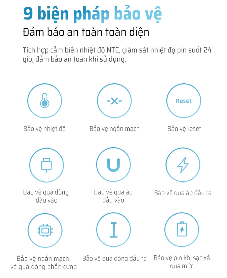 - Bảo vệ an toàn: Quá áp, quá dòng, quá nhiệt