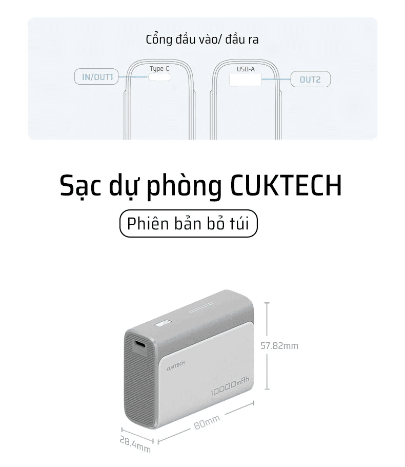 Pin sạc dự phòng 10000mAh CUKTECH PB100 30W không chỉ là một thiết bị cung cấp năng lượng, mà còn là người đồng hành tin cậy trong mọi hoàn cảnh. Với khả năng sạc nhanh, dung lượng vừa đủ, thiết kế gọn nhẹ và tính tương thích cao, đây là sản phẩm hoàn hảo cho nhu cầu di động hiện đại. Hãy sở hữu ngay CUKTECH PB100 để luôn chủ động nguồn năng lượng mọi lúc, mọi nơi.
