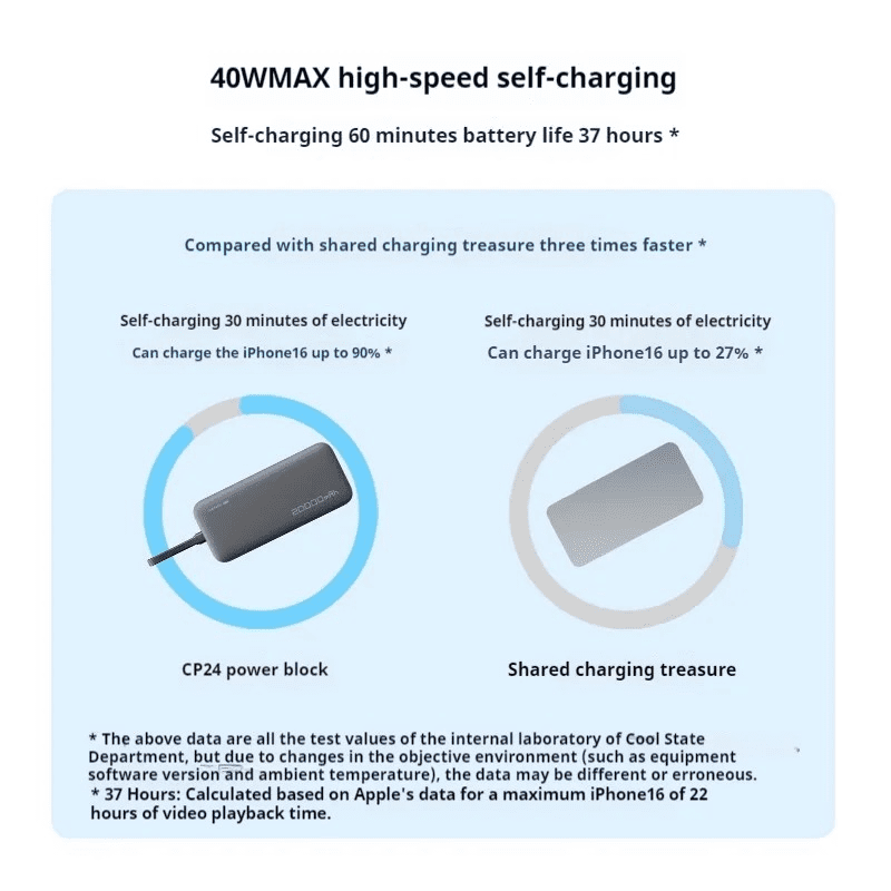 Với công suất sạc nhanh tối đa 40W, CUKTECH LPB200N có thể rút ngắn đáng kể thời gian sạc cho các thiết bị của bạn. Đặc biệt, pin hỗ trợ chuẩn Power Delivery (PD), tương thích với nhiều thiết bị hiện đại, từ điện thoại flagship, máy tính bảng cho đến laptop. Việc cung cấp nhiều mức điện áp như 5V, 9V, 12V và 15V giúp pin đáp ứng đa dạng nhu cầu sạc, đảm bảo tốc độ cao mà vẫn duy trì độ ổn định cho thiết bị.