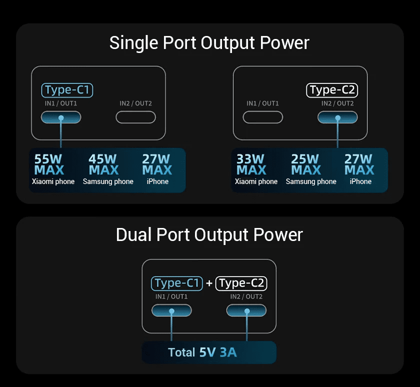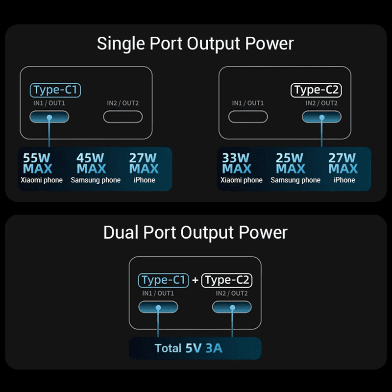 - OUT1(Type-C): 5V–3A, 9V–3A, 12V–2.5A, 15V–2.6A, 5-11V–6A, 5-20V–2.5A, 55W MAX