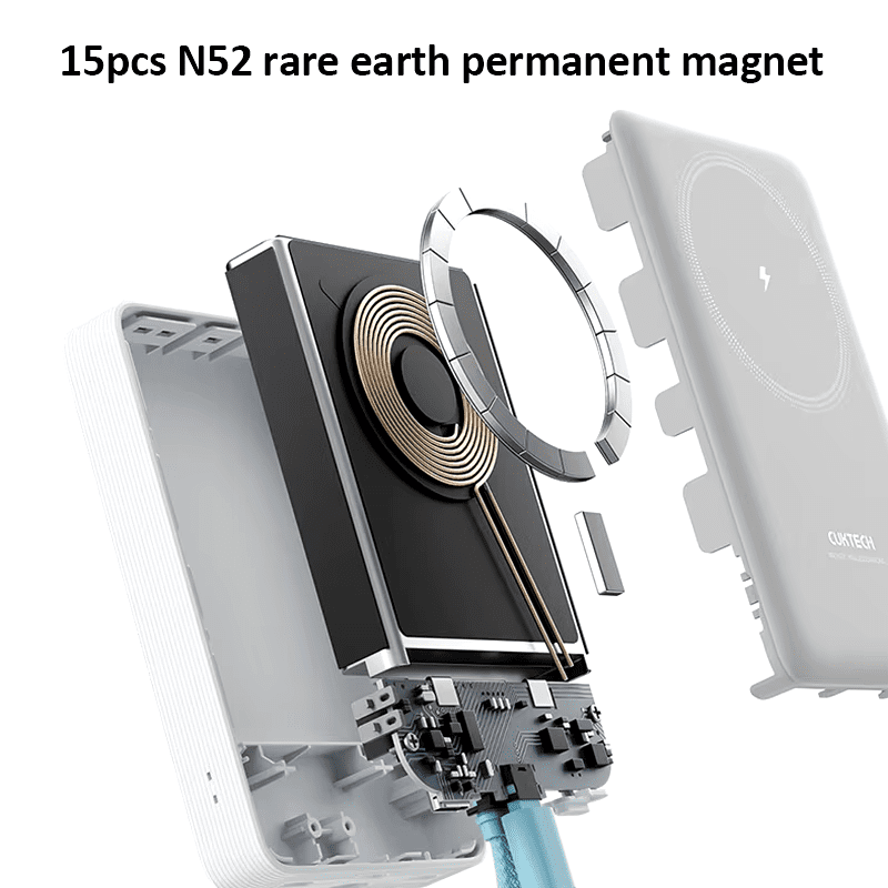 Cuktech WPB100L sử dụng 15 nam châm đất hiếm N52 với lực hút mạnh, giúp thiết bị bám chặt vào điện thoại, đặc biệt hữu ích cho iPhone hỗ trợ MagSafe. Lực hút này đủ để giữ chắc điện thoại kể cả khi đang cầm di chuyển, hạn chế rơi rớt hoặc lệch vị trí khi sạc.